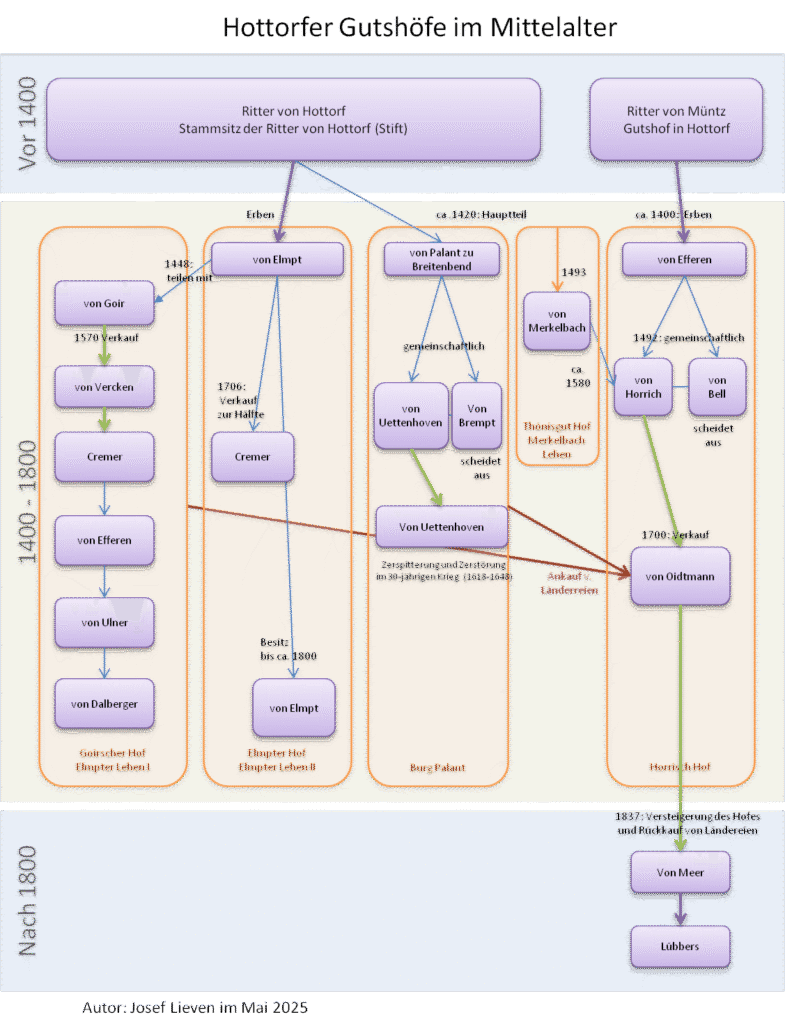 Neben der Palantschen Burg hielt die ehemalige Ritterfamilie von Hottorf bzw. ihre Erben, die von Goir, ihren Sitz. Der Keller am Eingange des Dorfes von Müntz her gehörte ihrem Hause. 1448 teilten sie mit einem von Elmpt, bereits 1570 sahen sie sich aber durch Geldnot zum Verkauf ihres Teiles an Heinrich von Merken genötigt; dessen Nachkommen verkauften ebenfalls wieder durch Schulden gezwungen, an den Bürger Cremer in Jülich. Dessen Erben aber mußten die Erwerbung gegen Erstattung ihrer Auslagen abtreten an die Gräfin von Efferen, von der es an von Ulner und zuletzt an von Dalberger kam. Der von Elmptsche Teil kam 1706 zu Hälfte ebenfalls in die Hände eines Jülicher Geldmannes Wilhelm Cremer; die andere Hälfte blieb bis gegen 1800 im Besitze der Erben von Elmpt.