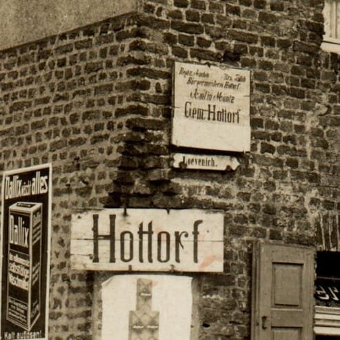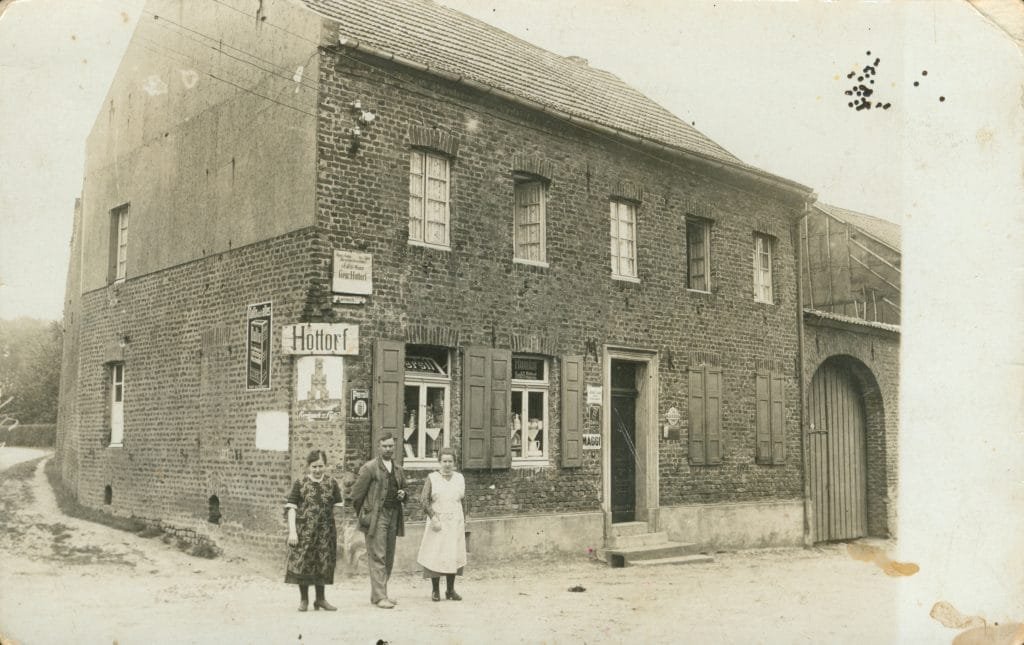 Das Ortsschild befand sich am heutigen Haus Georgstraße 1 direkt gegenüber der Kirche. Das Geschäft „Drogen- und Kolonialwaren von Joseph Lieven“ (weißes Schild links neben der Haustür) war typisch für die 1920er/1930er Jahre in ländlichen Dörfern, wo Kolonialwaren (Kaffee, Gewürze, Tee) und Drogerieartikel verkauft wurden.