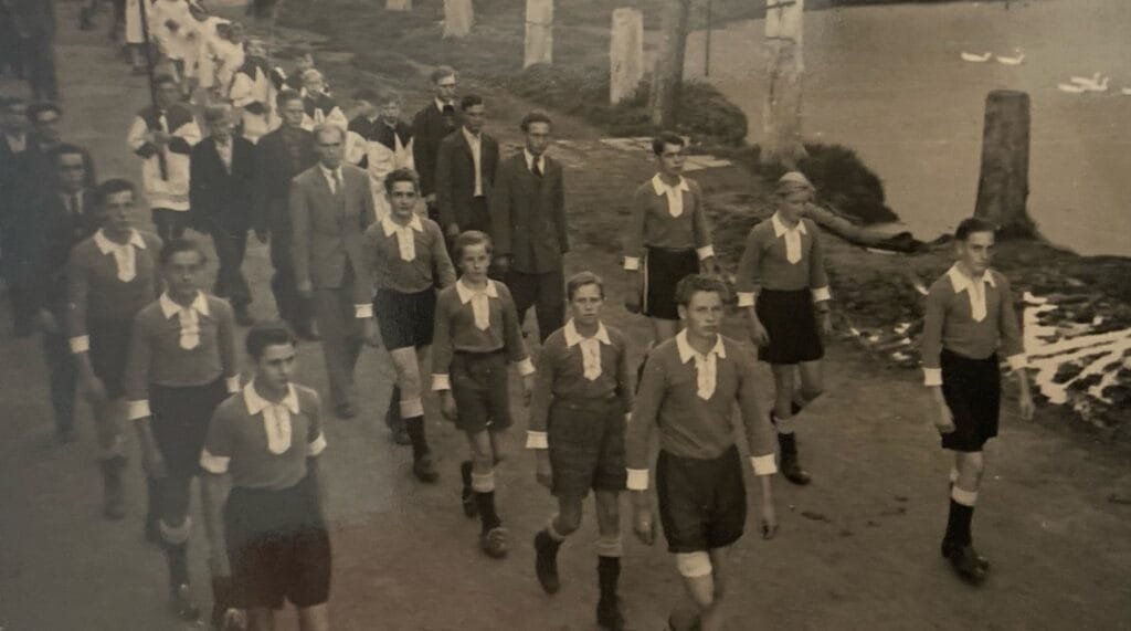 Wir Laien richteten selbst Andachten ein, aber die Kirche war eben doch nur ein Bethaus, kein Gotteshaus. Die Zusammenkünfte freitags schlossen wir meist mit einem Marienlied; wir nahmen uns vor, dem Feierstundeläuten um 11 Uhr vormittags und 6 Uhr abends wieder den Sinn des Engel des Herrn zu geben und für diese Zeit in jeder Arbeit inne zu halten, aber die Sehnsucht nach der Kath. Heimat wuchs in allen, bis auforaust8 in uns der gewaltige Chor: „Beglückt darf nun Dich, o Heimat, ich schauen.“