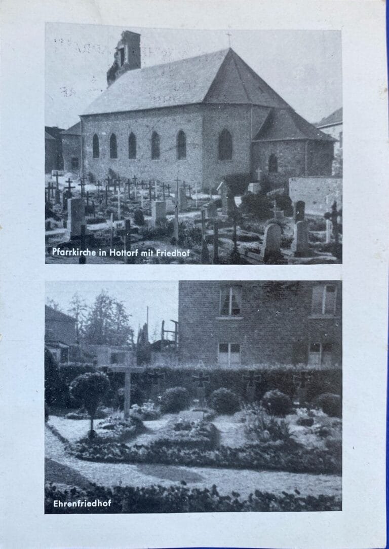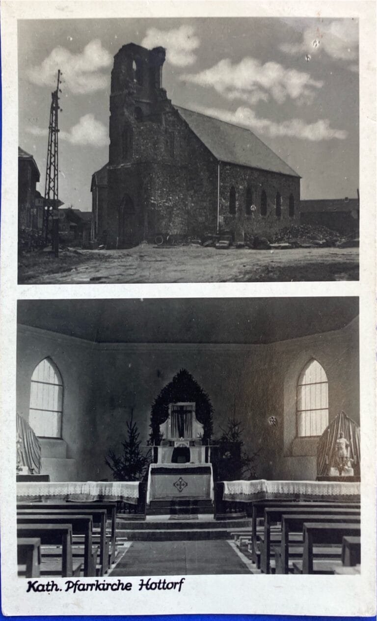 Das Photoalbum zum Wiederaufbau der Kirche zeigt die Arbeiten am Aufbau des Kirchtenturm und das geschmückte Innere der Kirche zur Erstkommunion am 26. Mai 1949.