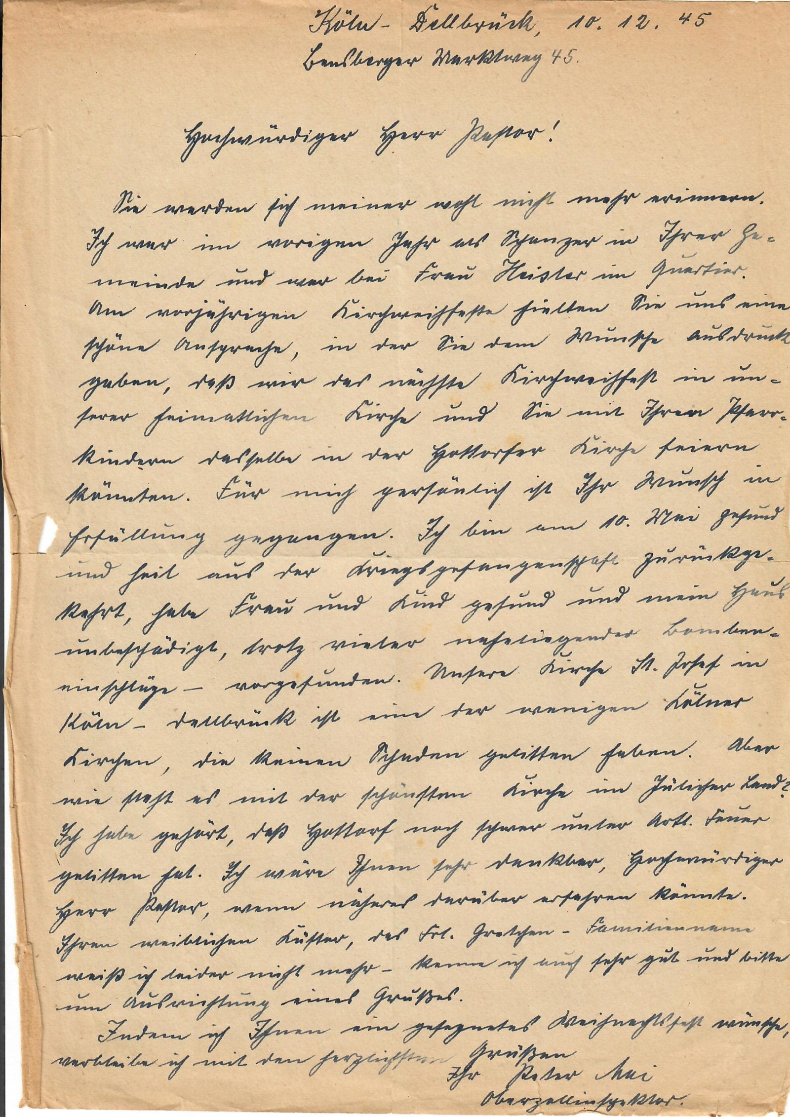 Sie werden sich meiner wohl nicht mehr erinnern. Ich war im vorigen Jahr als Schanzer in Ihrer Gemeinde und war bei Frau Heister im Quartier. Am vorjährigen Kirchweihfeste hielten Sie uns eine schöne Ansprache, in der Sie dem Wunsche Ausdruck geben, daß wir das nächste Kirchweihfest in unserer heimatlichen Kirche und Sie mit Ihrer Pfarrkindern dasselbe in der Hottorfer Kirche feiern könnten. Für mich persönlich ist Ihr Wunsch in Erfüllung gegangen. Ich bin am 10. Mai gesund und heil aus der Kriegsgefangenschaft zurückgekehrt, habe Frau und Kind gesund und mein Haus unbeschädigt, trotz vieler naheliegender Bombeneinschläge, vorgefunden. Unsere Kirche St. Josef in Köln-Delbrück ist eine der wenigen Kölner Kirchen, die keinen Schaden gelitten haben. Aber wie steht es mit der schönsten Kirche im Jülicher Land? Ich habe gehört, daß Hottorf noch schwer unter Artilleriefeuer gelitten hat. Ich wäre Ihnen sehr dankbar, Hochwürdiger Herr Pastor, wenn näheres darüber erfahren könnte.