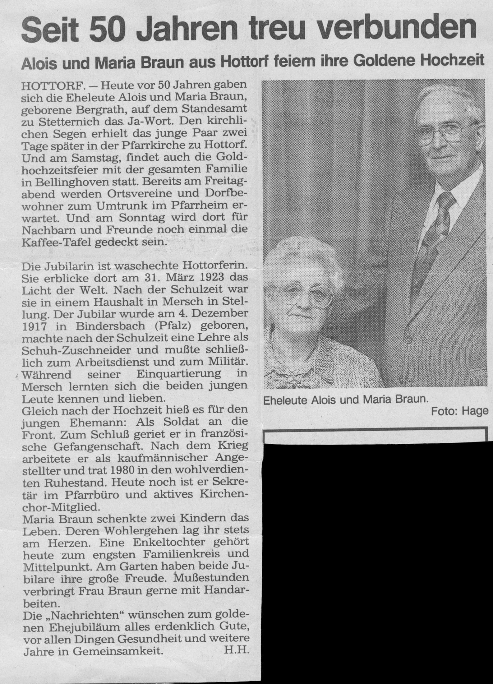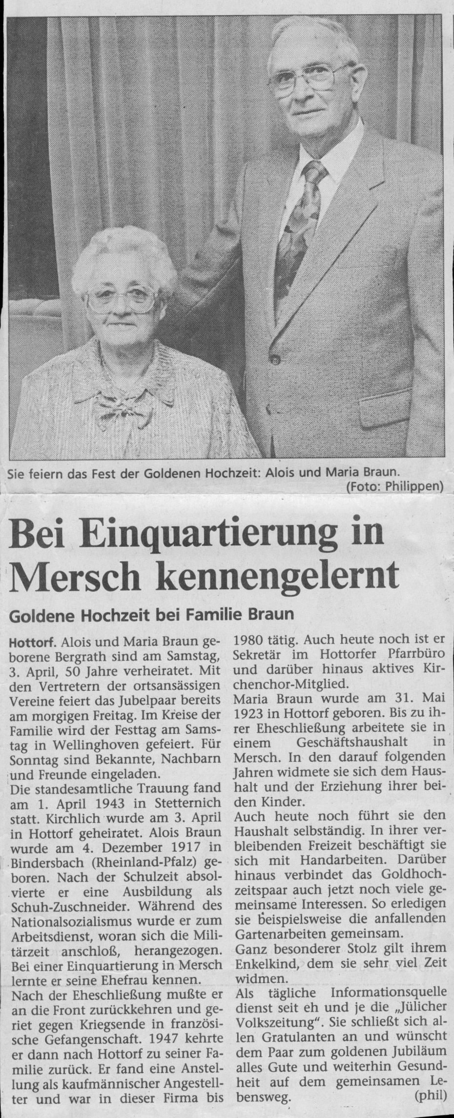 Goldhochzeit BraunOrtsgeschichte / 3. April 1993 | Umtrunk mit Ortsvereinen und Dorfbewohnern |Alois und Maria Braun feiern 50-jähriges Ehejubiläum. Die Lokalzeitungen berichten: