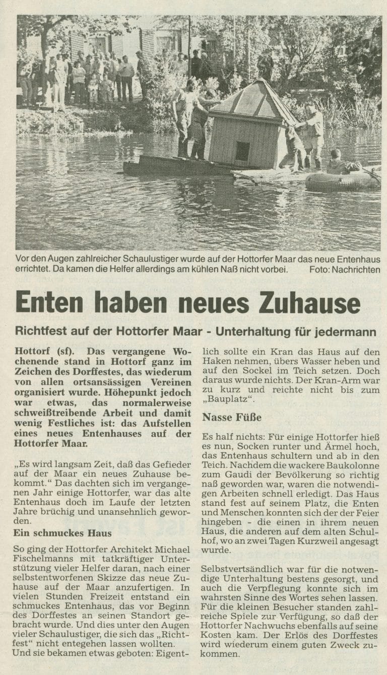 Mit Erlösen aus dem Dorffest hat die Dorfgemeinschaft ein neues Entenhaus aufgesetzt. Der Entwurf stammt vom Michael Fischelmanns. Beim Aufsetzen haben viele tatkräftige Hände unterstützt. Da das aufsetzen im Rahmen des Dorffestes erfolgte, gab es auch viele Zuschauer. Die Jülicher Nachrichten titulieren auf dem Deckblatt „Hottorf: Das Richtfest fürs Entenhaus wurde ein nasses Unterfangen“
