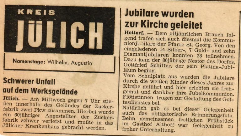 Im Auftrag unseres Bischofs schrieb mir der Regionaldekan der Region Düren vor einigen Tagen „Unbeschadet ihre Aufgaben als Pfarrer von Tetz bestelle ich sie gleichzeitig zum Pfarrverweser der Pfarre St. Georg zu Hottorf…“. Da habe ich mir zunächst gedacht: Was soll nun werden? Zwei soweit voneinander entfernt liegende Orte, dazu die Schulen wieder in einem anderen Ort! Aber Ihr wisst auch, daß infolge des enormen Priestermangels es dem Bischof kaum noch möglich ist, in die kleineren Pfarrreien wie bisher einen Priester zu senden.