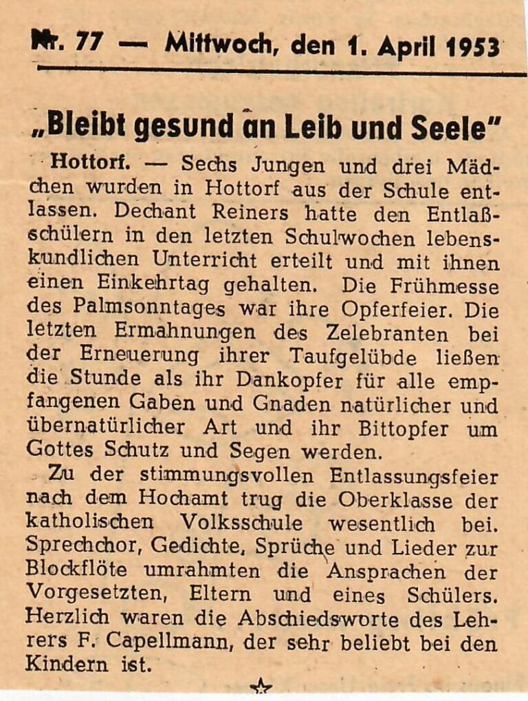 9 Kinder aus der Schule entlassen 29. März 1953 | Entlassungsfeier nach dem Hochamt |Die Lokalzeitung berichtet:
