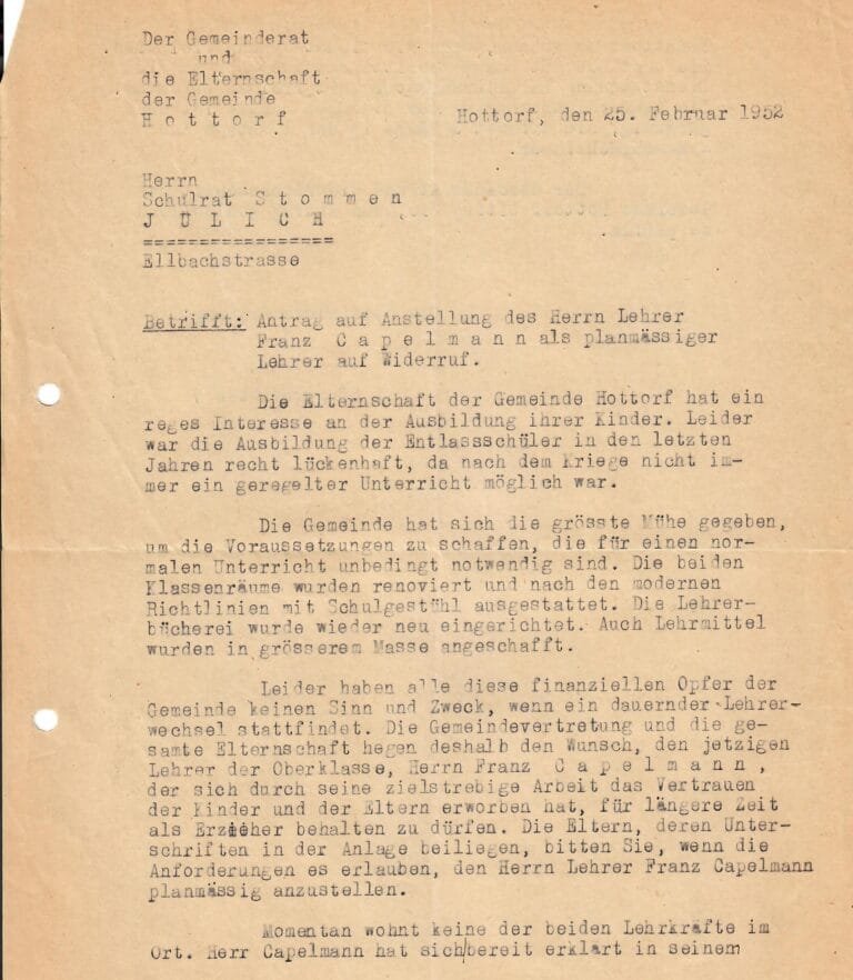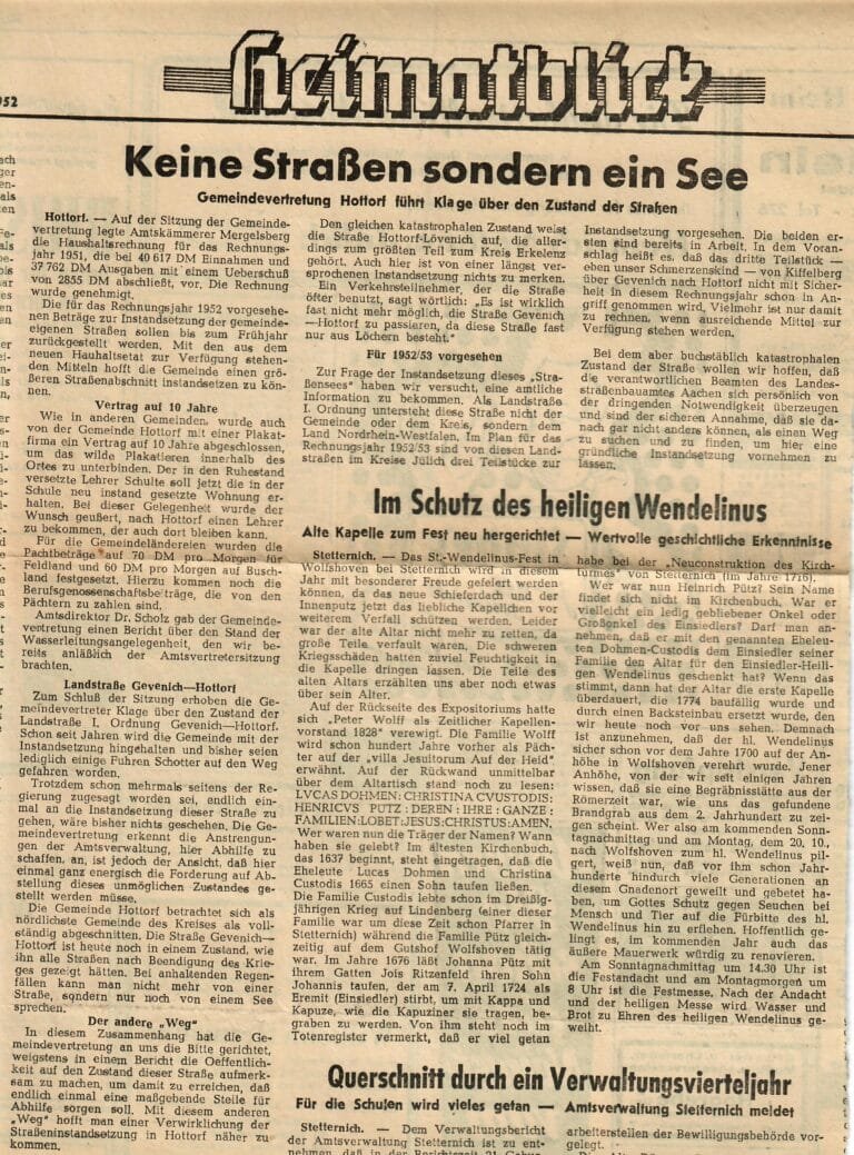 Auszug: „Ein freudige Überraschung erlebte die Pfarrgemeinde Hottorf an den Ostertagen 1952, als sie ihren Pfarrpatron, den stolzen Ritter und Drachentöter St. Georg, und ihre Madonna wieder heil und in ihrem neuen goldverbrämten Farbenkleid auf den noch provisorischen Altären sah. Dazu (einstweilen in Fensternischen) die seit 1944 nicht mehr gesehenen Statuen des heiligen Antonius von Padua und des Herzens Jesu. Bildhauer Josef Esser aus Kirchberg hatte sie in der Fastenzeit von ihren Kriegswunden durch den Granatbeschuß aus dem schrecklichen Winter 1944/45 geheilt.