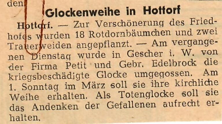 Am ersten Sonntag im März (04.03.1951) erhält sie ihre kirchliche Weihe auf den Namen des Pfarrpatrons St. Georg zum bleibenden Andenken an die Opfer zweier Weltkriege. Sie wird künftig zum Totengeläut eingesetzt.