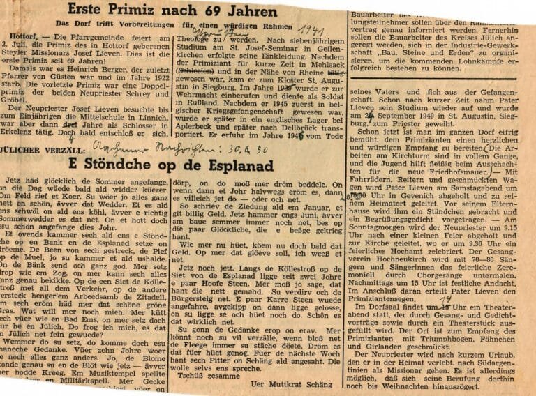 Nun begann das feierliche Levitenamt. Der gemischte Kirchenchor von Hochneukirch sang die vierstimmige Messe „Stella maris“ von Griessbacher mit einigen Einlagen. Die eindrucksvolle Festpredigt hiel ein Lehrer des Styler Missionshauses St. Josef in Geilenkirchen, Herr Pater Brüggemann. Nach einletenden Worten zeichnete er den Weg des schossergesellen lieven zum diener Gottes. Er betonte besonders die großen Hindernisse, die sich dem spät Gerufenen entgegenstellten, wie Schwierigkeiten des Lernens, Gefahren der Kriegs- und Gefangenschaftsjahre. Aber bei allen Berufskrisenhörte der Theologe deutlich die Worte des Meisters: „Folge mir nach“. Im zweiten Teil skizzierte der Prediger die Würde des Priesterstums und seine erhabenen Aufgaben – zu weihen, zu segnen, zu predigen, die Sakramente zu spenden, das Hl. Messopfer dazubringen. Atemlose Stille herrschte in dem überfüllten Gotteshause, als der junge Priester zum ersten Male in seiner heimat die Wandlungsworte sprach und seiner Mutter auf dem Chore und seinen Verwandten den Leib Christe reichte. Nachdem er der harrenden Menge den Segen erteilt hatte, wurde er weider zu seinem Elternhaus geleitet.