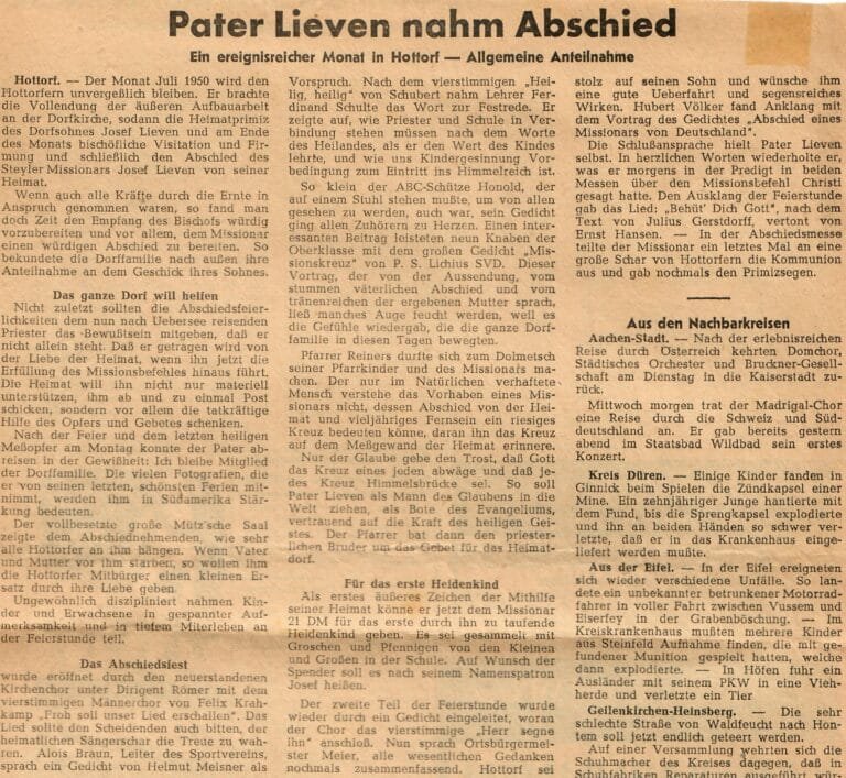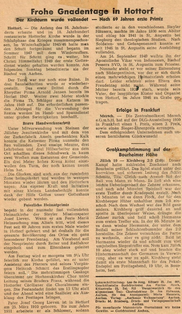 Zur Verschönerung des seltenen Festes war der Bruder des Primizianten, der Küster und Organist in Hochneukirch tätig ist, mit dem dortigen Kirchenchor (zirka 80 Sänger und Sängerinnen) nach hier gekommen. In seiner Ansprache in der festlich geschmückten Pfarrkirche zog Herr Pfarrer Reiners einen Vergleich zwischen dem Festtagsgedanken – dem besuch Mariens bei Elisabeth – und dem heutigen Tage in Hottorf. Wie damals, so auch heute, ein Freuden- und Gnadentag für beide Teile. Als sinnvolles Geschenk legte dem jungen Missionar eine neue Kasel um. Wie sie ganz den Priester einhüllt, so habe der Hohepriester Jesus Christus den Menschen Josef Lieven in seiner priesterlichen Würde aufgenommen und so solle auch die Liebe und Sorge der Hottorfer den Missionar bei seinem Wirken im fernen Südargentinien einhüllen.ausser der Kasel hatte die Gemeinde schon zur Weihe am 14. September 1949 in St. Augustin bei Siegburg eine vergoldeten Silberkelch geschenkt.