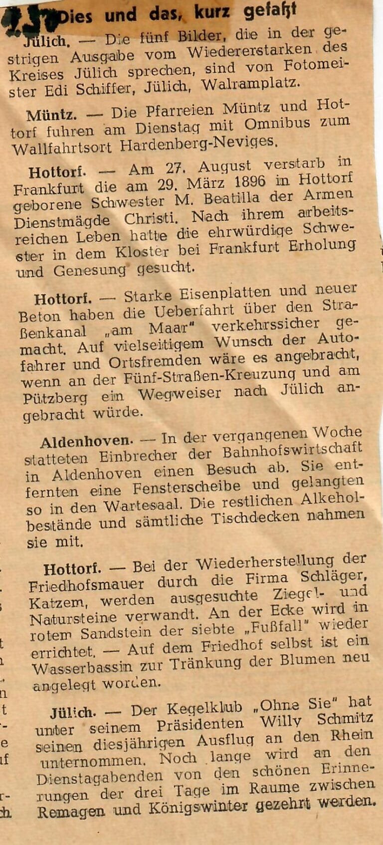 Nicht eingeweihte Besucher staunten Samstag in Hottorf. Viele rege Hände säuberten die Straßen, befestigte Fahnen, an Masten, spannten Wimpel über die Straße, wanden Kränze und Girlande an Triumpfbogen, machten aus eine Wald von zweigen ein wunderbares Baumspallier, und schließlich wurden sogar noch zwei Teppiche und ein Läufer aus gefärbten Sägemehl hergestellt. Christliche Symbole waren sinnvoll darin angeordnet. Die Strasse zwischen Kirche und Vikarie , dem Elternhause des primizianten, war besonderders festlich geschmückt. Aber auch die anderen Strassen waren sauber gehalten und viele Fahnen gaben dem Ort eine festliche Note.Selbst der vorige Woche wieder hergestellte Turm hatte vielfachen Fahnenschmuck angelegt und abends leuchtete weithin in die Lande ein wuchtiges, von Scheinwerfern angestrahltes Kreuz.