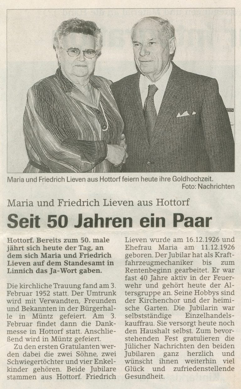 An ihrem 75. Geburtstag tritt Frau Maria Krafft in den Ruhestand. Die Jülicher Zeitung berichtet: „Maria Krafft ist in Hottorf eine Institution ‑ Mit Leib und Seele wirkte sie seit ihrem 15. Lebensjahr als Küsterin und Organistin in ihrer Heimatpfarre.“