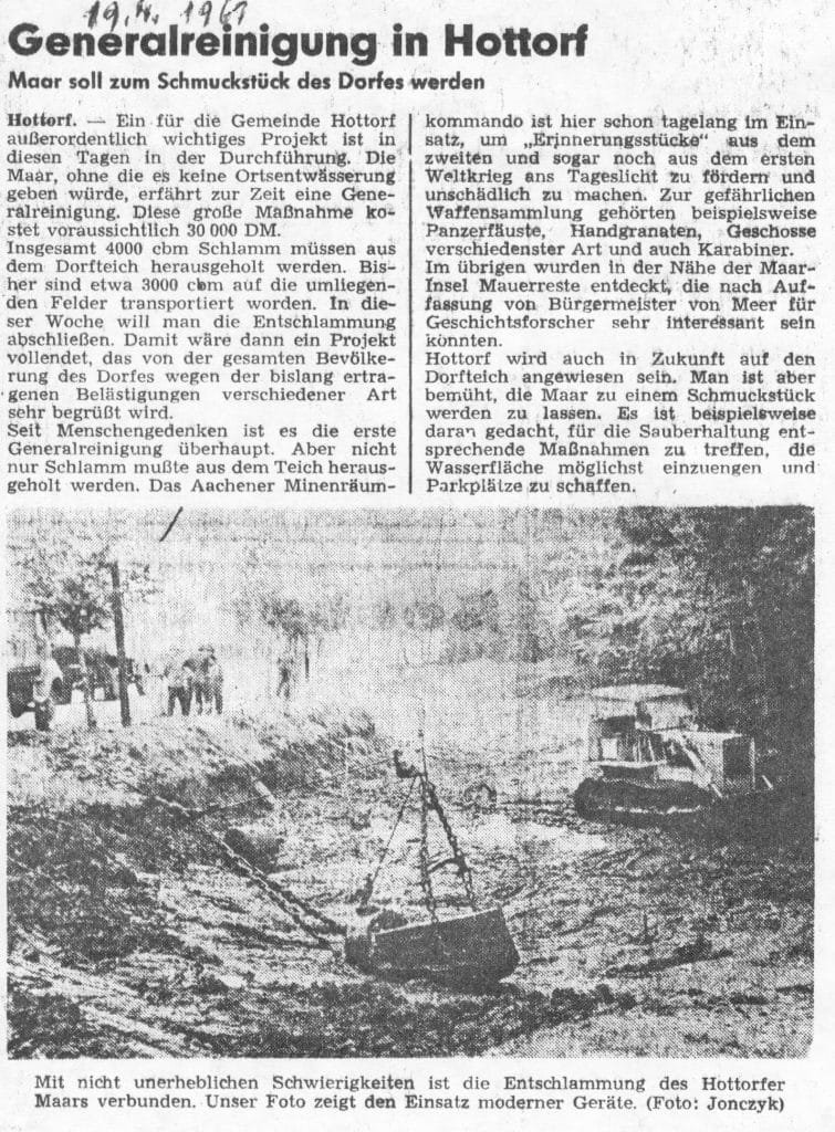 Die Schulchronik hält fest: „Das Ereignis des Jahres ist unzweifelhaft die Entschlammung der Maar, die dann hoffentlich eine Zierde des Dorfes wird. Die Kosten werden sich voraussichtlich auf mindestens 30.000 DM belaufen. Der Schlamm wird mit Lastwagen auf Felder befördert und kann endlich mal als Dünger einen nützlichen Dienst erfüllen. Das Aachener Minenräumkommando hat gefährliches Kriegsmaterial (Minen, Karabiner, …) gefunden. Außerdem sind Mauerreste entdeckt worden. Es bleibt noch festzustellen, aus welcher Zeit sie stammen und zu welchem Gebäude sie gehörten.“