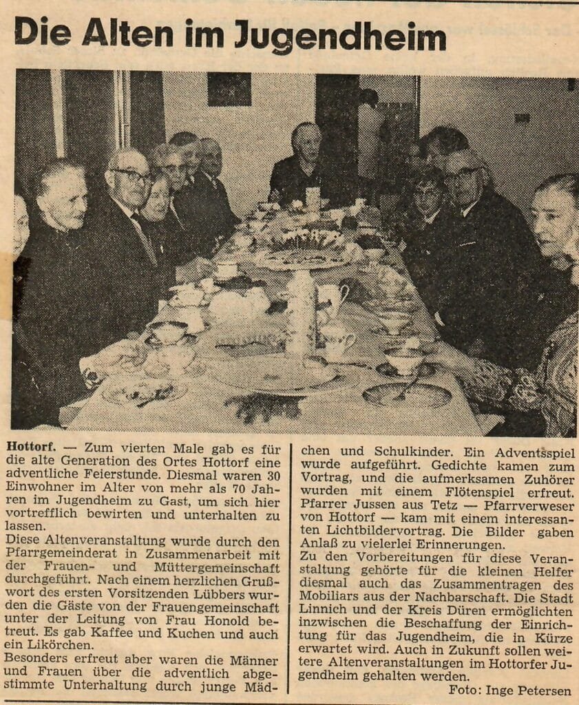 Nun hat die Frauengemeinschaft die Initiative ergriffen und die Tradition neu belebt. Der Einladung zum ersten Seniorenkaffee folgten rund 40 Hottorferinnen und Hottorfer ab dem 65. Lebensjahr. In geselliger Atmosphäre verbrachten die Gäste einen unterhaltsamen Nachmittag bei Kaffee, Kuchen und angeregten Gesprächen.