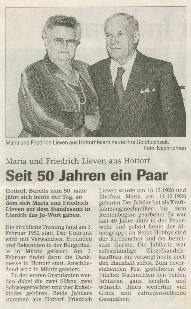 Goldhochzeit Braun 3. April 1993 | Umtrunk mit Ortsvereinen und Dorfbewohnern |Alois und Maria Braun feiern 50-jähriges Ehejubiläum. Die Lokalzeitungen berichten:
